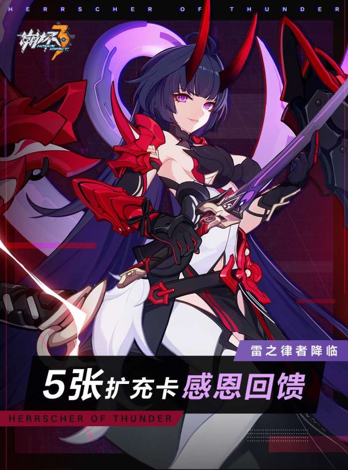 雷电芽衣「雷之律者」登场后,受到了舰长们的热情支持,取得了非常优异的成绩,登上了AppStore畅销榜的前三名。 为了纪念这一闪耀的时刻,感谢大家的喜爱与支持,我们决定向全服20级及以上的舰长发放5张扩充补给卡~ 愿舰长欧气满满! ======福利内容====== 扩充补给卡*5 ======发放对象====== 全服20级及以上的舰长 ======领取时间====== 7月11日14:00-8月10日4:00 ======领取方式====== 活动期间,登录游戏即可通过舰桥下方的信封领取奖励。