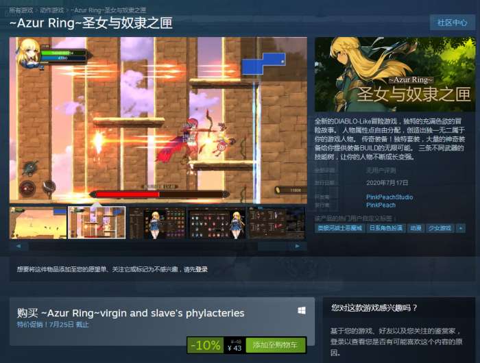 根据Steam商城页面公开的新消息,DIABLO-Like冒险游戏《~Azur Ring~圣女与奴隶之匣》今日登陆Steam平台,目前已经开启国区特惠,折后价43元,以下为官方公开的游戏介绍内容。