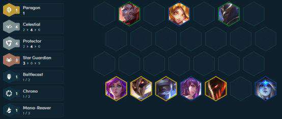 5人口我们补加一张皇子即可,或者我们补加一张妮蔻或者其他的圣盾使费卡,谁的质量高就上谁,高质量保证自身不持有装备的打工能力,也是为了进一步锁定连胜。6人口转折点来了,这里我们换下皇子用洛代替上场,随后多余人口补加寒冰,这样就组成了4星神2斗士2圣盾使的过渡体系。