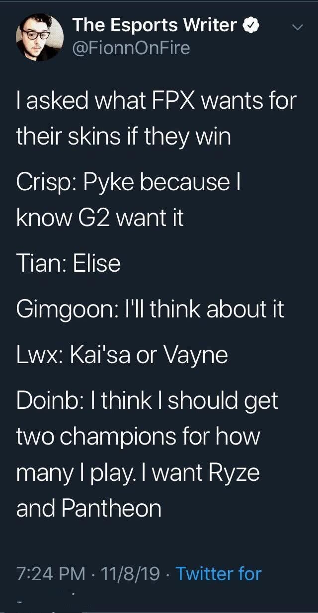 中单Doinb也是对此作出了回应,他想要的是两个英雄,分别为瑞兹和潘森,但是在比赛之后他的泰坦实在太过于优秀,也带领他夺得这次的冠 军,所以有可能后选择的是泰坦。