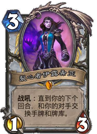 7,裂心者伊露希亚(S),预览季击穿各大论坛的神卡,其对OTK卡组的伤害力实在巨大,间接导致目前狂野环境OTK卡组的消失,即便被削了一刀,依然无伤大雅!