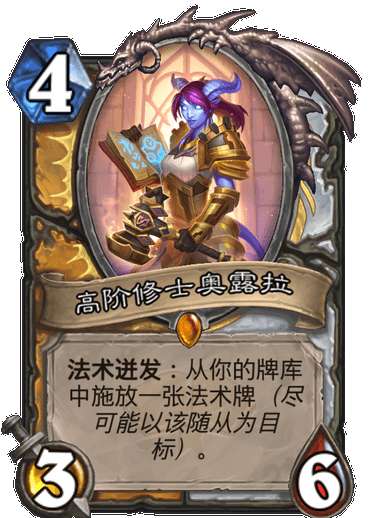 10,高阶修士奥露拉(S),也是一张朴实无华的卡,和圣契骑相性高,属于必带的卡,圣骑士这版本胜率高,虽然高分段不明显,但是依然有可玩性的。