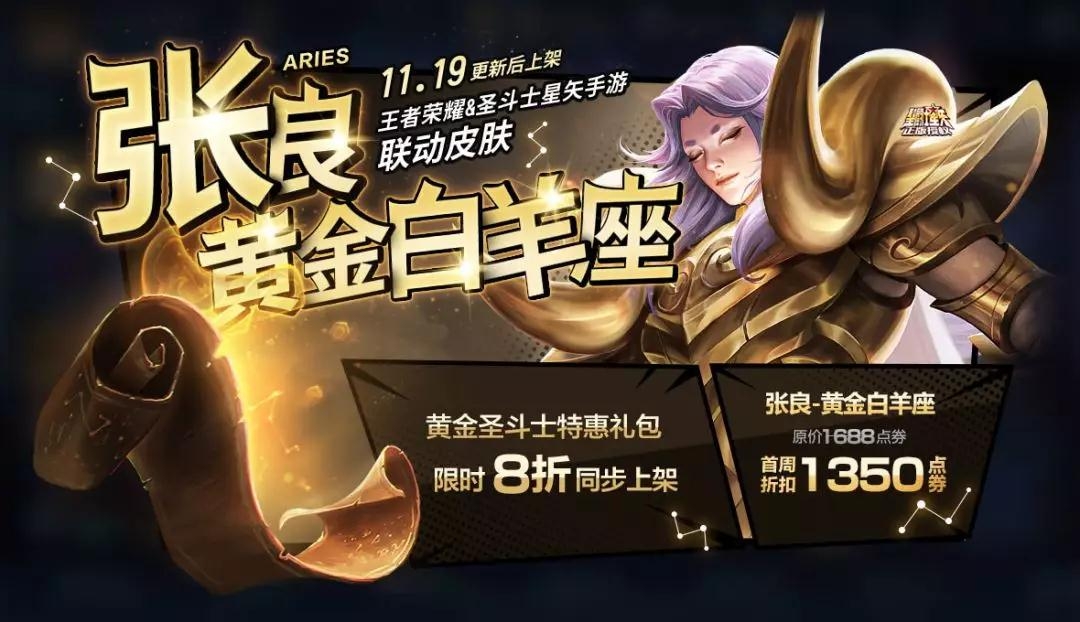 除了张良新皮肤限时特优,王者荣耀还将三款黄金圣斗士皮肤(张良-黄金白羊座、达摩-黄金狮子座、后羿-黄金射手座)打包折扣出售,礼包价格为4051点券(原价5064点券),礼包上架时间:11月19日更新后~11月25日23:59。