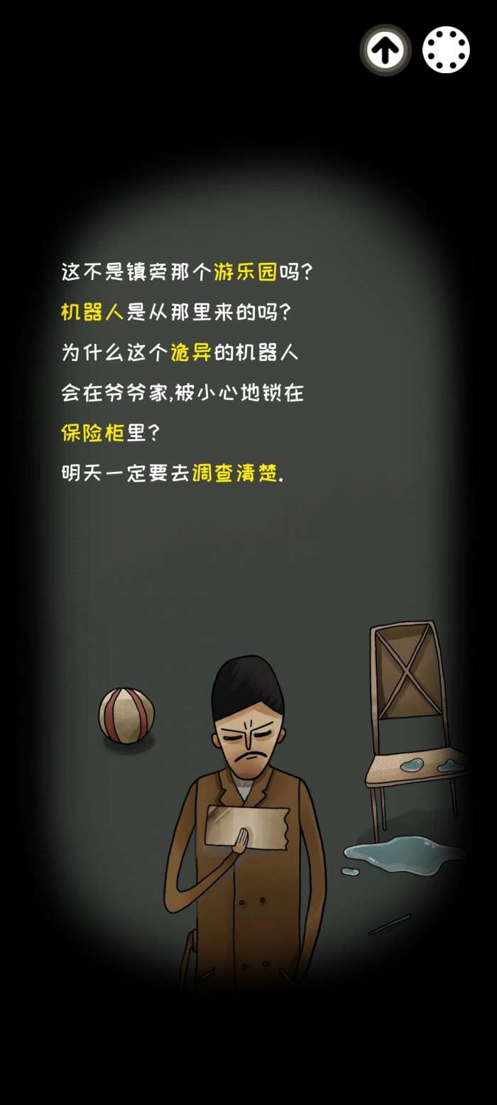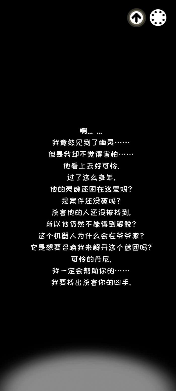 一直往下划通过对话来到第十一章按红色按钮把飞镖投出去并没有中到小机器人,于是我把机器人偷走,被丹尼发现,把丹尼推下湖逃回家问奶奶星期几,还记得之前有关命案的小纸条吗,上面是1978年10月14日,星期六,奶奶说今天星期五,所以把日期往前推一天,得到10月13日点击吱吱向爷爷坦白,失忆,被爸爸接走。