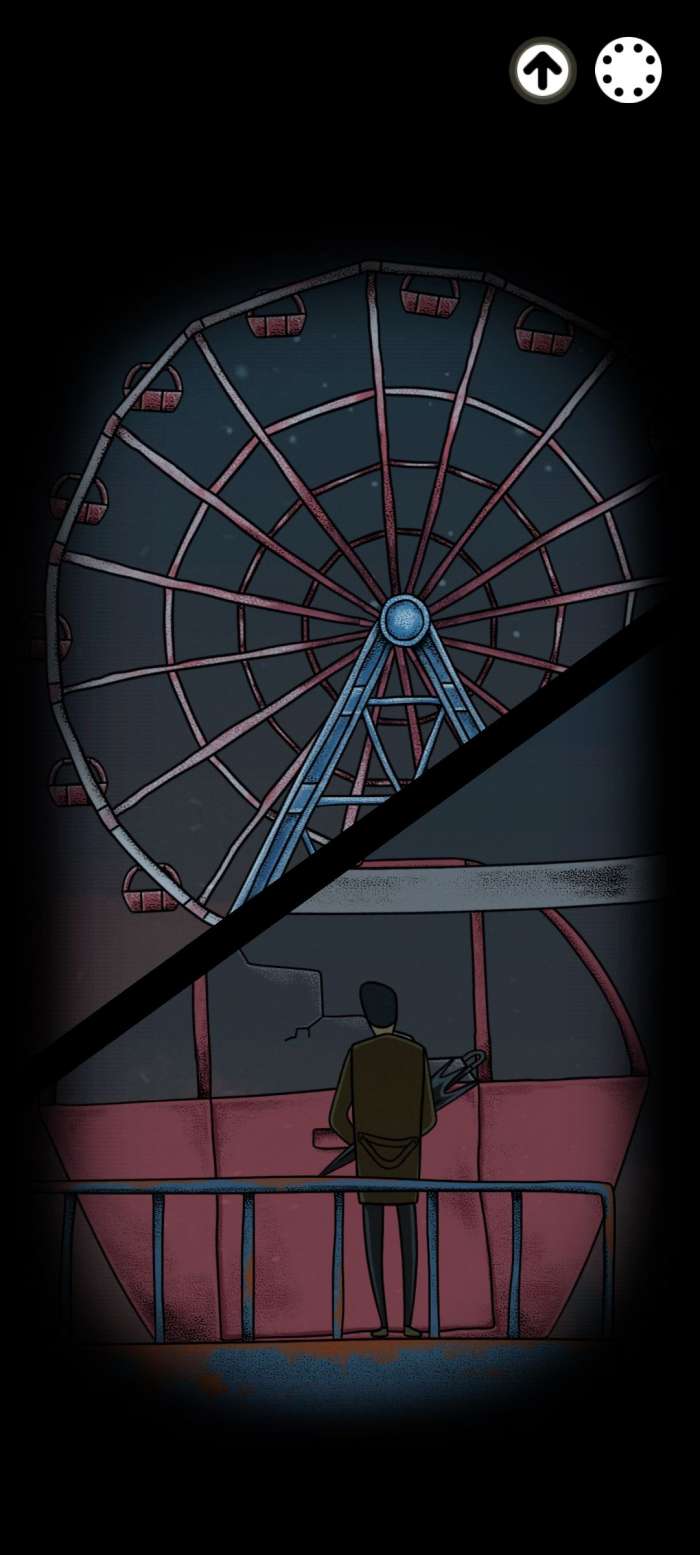 我们返回之前广告那张图,会发现倒影发生了变化,根据倒影里我标了黄色箭头的地方,可以解开摩天轮的谜题移动摩天轮,把玻璃破了的那一个移到主角面前