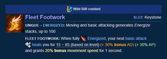 被动:攻击和移动会积攒能量层数。在100层时,你的下次攻击会触发充盈能量,治疗你的生命值并提供额外移动速度。