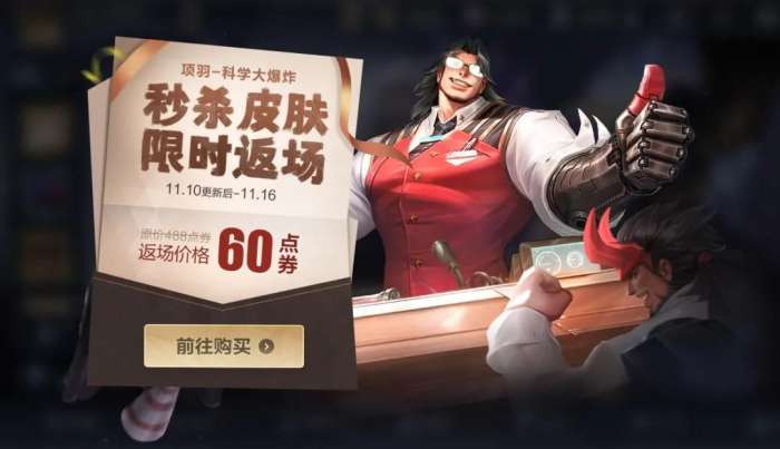 温馨提示:本次返场后,项羽-科学大爆炸后续将填充至积分夺宝奖池,和曹操-死神来了、达摩-拳皇、王昭君-幻想奇妙夜做轮换,召唤师们千万别错过哟!