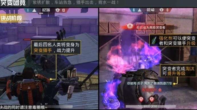 突变团竞,可通过模式选择-团队竞技-突变团竞进行体验;在该玩法中,一共有16名玩家加入战场。每回合开始将会有3名特种兵发生突变成为强化战士。特种兵需要团结起来抵抗强化战士,强化战士则需要尽可能的去淘汰更多的特种兵,最后2名特种兵会进化成更强力的超级猎手。