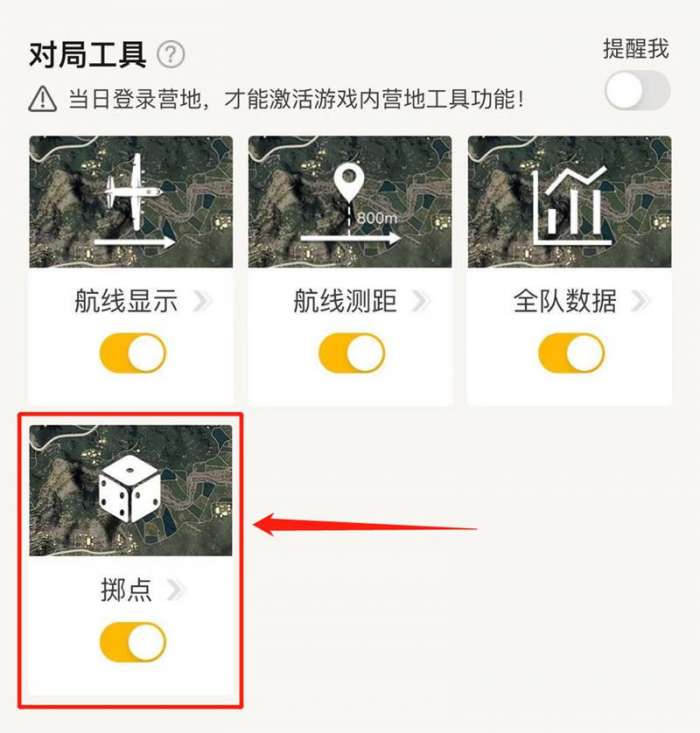 然后再到和平营地的游戏工具中,点击开启掷点工具后,从和平营地进入游戏,即可在游戏里使用掷点工具啦!