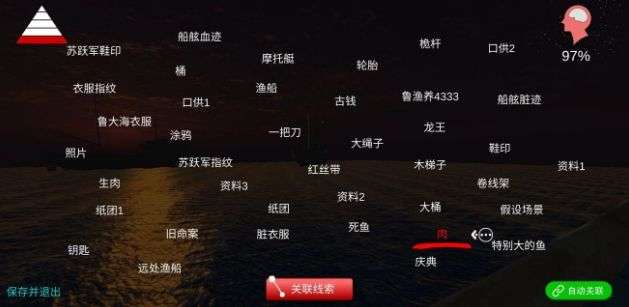 人肉:(获得“生肉”后与小赵对话)船上有一块人肉,从切口看是用刀切下来的。