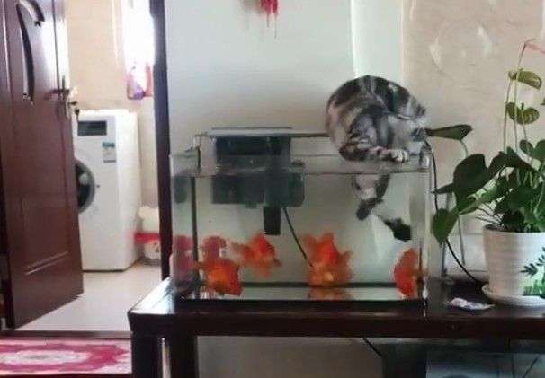 全网唯一一只掉进鱼缸里的猫咪,神速自救!鱼:我当时害怕极了!