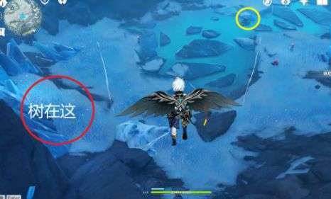 下来后看上图,红圈是树的位置,但是靠近不了,得打完黄圈处的一个挑战(挑战限时)建议先找三条金龙鱼把柱子点亮了再打。