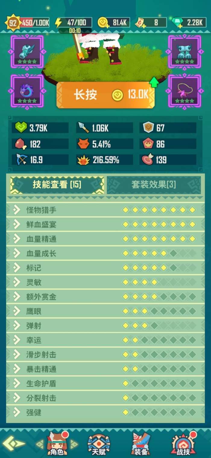 推荐带大风车和大拍地(能眩晕的那个)大拍地用来打断boss一些技能大风车可以触发怪猎等词条打伤害和无敌很好用,别的技能不推荐,加血的很慢且限制行动,1技能没伤害,最后那个突脸谁用谁知道,直接送。面板的数据在我看来只有射程生命和抗性有用,抗性可以让你吃控的时候不至于再继续吃下一个技能。