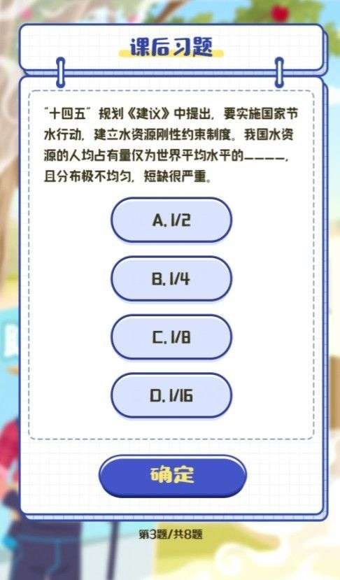 3.“十四五”规划《建议》中提出,要实施国家节水行动,建立水资源刚性约束制度。我国水资源的人均占有量仅为世界平均水平的_____且分布极不均匀,短缺很严重。