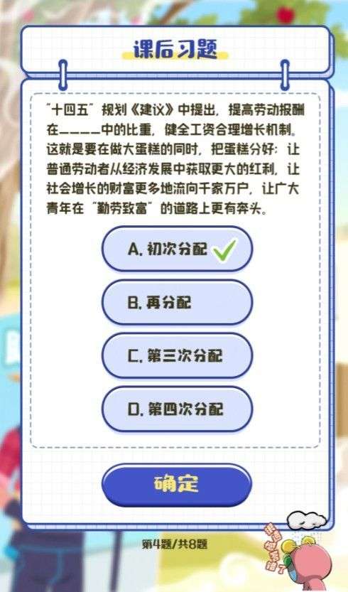 4.十四五”规划《建议》中提出,提高劳动报酬在_____中的比重,健全工资合理增长机制。这就是要在做大蛋糕的同时,把蛋糕分好;让普通劳动者从经济发展中获取更大的红利,让社会增长的财富更多地流向千家万户,让广大青年在“勤劳致富”的道路上更有奔头。