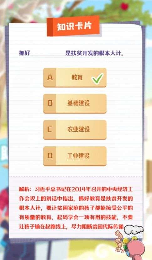 解析:习近平总书记在2014年召开的中央经济工作会议上的讲话中指出,抓好教育是扶贫开发的根本大计,要让贫困家庭的孩子都能接受公平的有质量的教育,起码学会一项有用的技能,不要让孩子输在起跑线上,尽力阻断贫困代际传递。