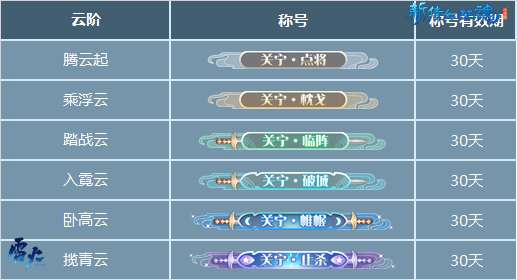 关宁青云赛在跨服关宁一到关宁十开放,三界英豪尽可在此论战。关宁青云赛共有6个云阶:腾云起、乘浮云、踏战云、入霓云、卧高云、揽青云。每场关宁结束,将根据胜负及战斗中的表现获得青云分,累积足够青云分即可提升云阶。对局的胜负不直接影响云阶升降,云阶的升降只和青云分挂钩,但是对局失利一方将在对局结束时扣除50青云分。玩家可以凭借自身实力,不断向上挑战,优胜者可一步步从腾云起至揽青云,用云阶彰显实力。