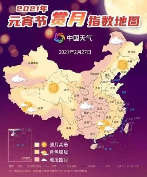 元宵节(2月26日)当天,我国北方大部降水稀少,适宜赏灯,吉林、辽宁、天津、北京、河北、山东、甘肃、青海等地大部地区天气晴朗、云量稀薄,可能看到“明月伴花灯”的景象;黑龙江西北部、内蒙古东北部、新疆北部、西藏南部以及陕西南部等地将有雪花飘落,可能欣赏到“正月十五雪打灯”的场景;安徽、江苏、上海、浙江、江西、湖北、湖南、福建、台湾、广东、广西以及贵州西部等地将有降雨,可能出现“雨打灯”的景象。