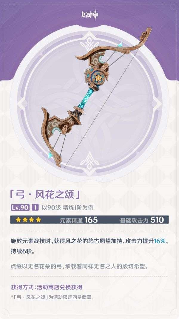 *「弓·风花之颂」为活动限定四星武器。参与「风花的邀约」活动,可在活动商店兑换获得活动专属武器「弓·风花之颂」