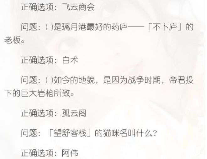 原神派蒙答题答案大全