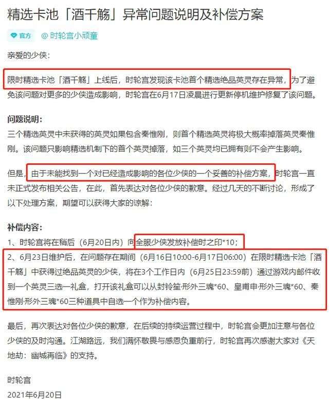 但是,由于未能找到一个对已经造成影响的各位少侠的一个妥善的补偿方案,时轮宫一直未正式发布相关公告,在此,首先表达对各位少侠的歉意。经过几天的不断讨论,形成了以下处理方案,期望可以获得大家的谅解。