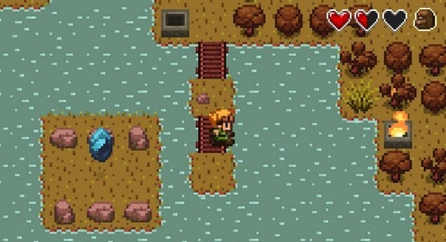 这里裂开的石头都能炸碎,炸弹能炸到自己,别没事自残。。这里会出现一些水晶,打一下就变成马赛克模式。。(回到过去)一些比较矮小的树木可以穿过去,在打一次就回到现代(3D模式),里面矮小的树木用原始模式能过去,石头台阶必须用现代模式才能过去。