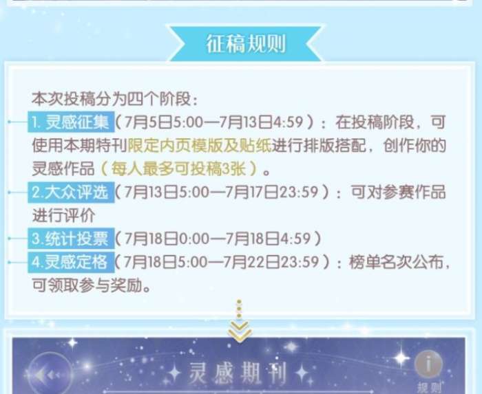 1、灵感征集(7月5日5:00-7月13日4:59):在投稿阶段,可使用本期特刊限定内页模版及贴纸进行排版搭配,创作你的灵感作品(每人最多可投稿3张)。