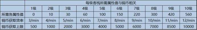 这里是客栈等级的对应的属性值和不同等级的铜币获取速率。很明显客栈等级越高,获得铜币的速率就越快,储存的铜币上线也越高。所以大家要努力提升客栈的等级呀。