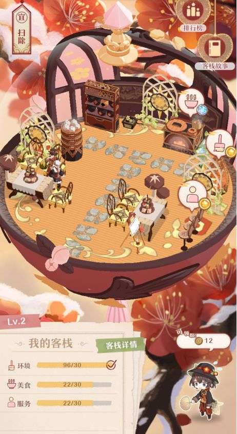 ②客栈详情:随着我们对客栈的维护,安排精灵们进行打扫、服务或者开灶做饭等事件,都可以提升下方客栈的属性不过会消耗精力,当属性达到一定数值后可以将客栈升级可以让客栈内部装修更加丰富好看,还可以提升铜币获得效率与获取上限。