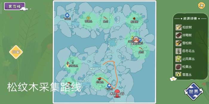 游戏中的松纹木是要从树上采集的,我们要前往雾雪峰的地图中间,在中间这一片位置找到松纹树。找到后直接点击右侧的砍伐按钮,就可以获得松纹木了。松纹树的刷新频率是30分钟左右一次,砍完了之后可以等刷新了再来砍。