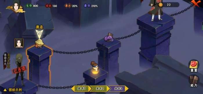 虽然前路的挑战充满“迷幻”,但是学员们却能通过每个格子上的图标来判断下一步将要面对的内容。图标大致分为“遭遇战”、“商店”、“神秘房间”、以及标明了忍者的“BOSS战”等。