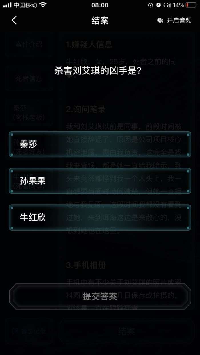 秦莎:今早客房其它客人投诉,说刘小姐房间手机一直晌,但没有人接听,而且昨晚刘小姐在我们地下室酒吧不小心伤到了胳膊,我担心有事情就上去看看,但一直无人应答,我觉得不对就用房卡进去了,结果发现了尸体。