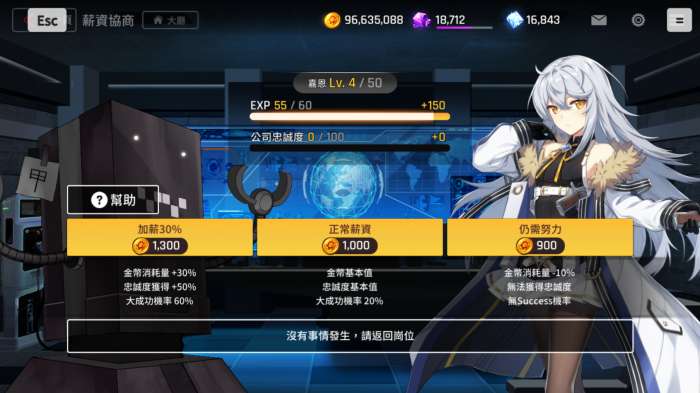 1、工资协商就是喂狗粮,共有三个选项,可以提升角色的忠诚度、等级等