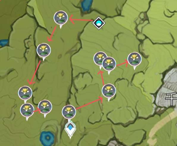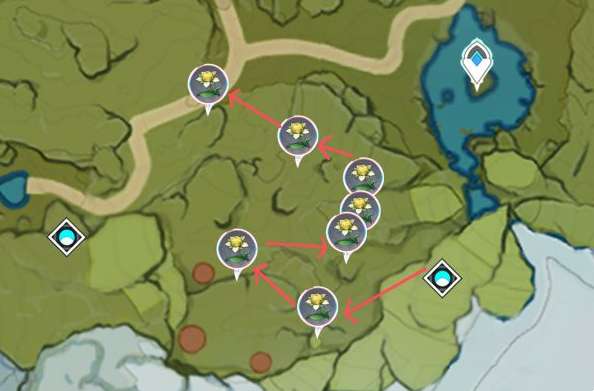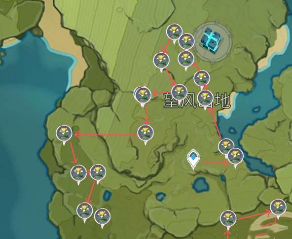 千风神殿甜甜花的位置分布并不是很聚集,玩家要采集的时候可以按照图中的路线行走,这里玩家可以获得10朵甜甜花。