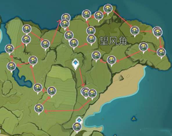 首先玩家可以前往望风山地,在这个地方一共有17朵甜甜花可以采集,采集的路线按照下面这张地图就可以了,能让玩家顺利的采集所有甜甜花。