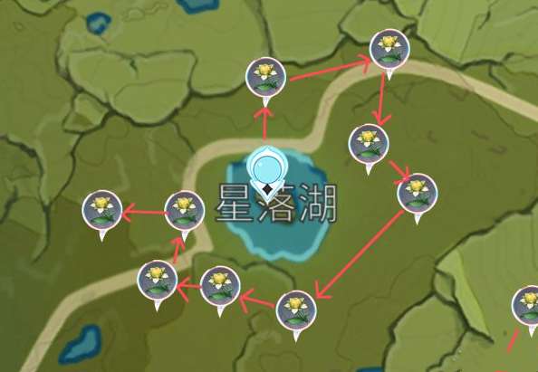 接下来就是星落湖,这里也分布了一些甜甜花,玩家按照小编提供的路线可以采集到9朵甜甜花。