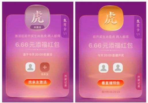 1、在活动期间生肖卡每天都会开奖,获取生肖卡后并进行激活即可有机会在当天获得6.66元添福红包;