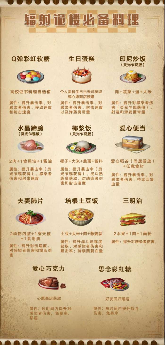和以往的食物推荐不同,新版本辐射诡楼的极品食物由生日蛋糕以及爱心巧克力领衔作为目前属性最佳的食物,在辐射诡楼中使用将大幅