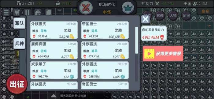 5、航海时代:这是目前最后一个时代了,可以在游玩一段时间后转生,也可以开始建造大量舰炮和来福兵,用来打架赚取继承点。