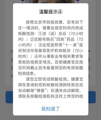 ——请本人立即完成核酸检测。健康宝将在查询到本人核酸检测阴性报告后自动解除“弹窗”。