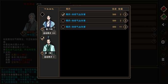 毒术等级依旧不影响,可能是我主角在队里,听说下毒失败是会直接进入战斗的,建议存个档。这里我连着下了7次毒都没有失败,所以我估计跟福源也有一定关系。