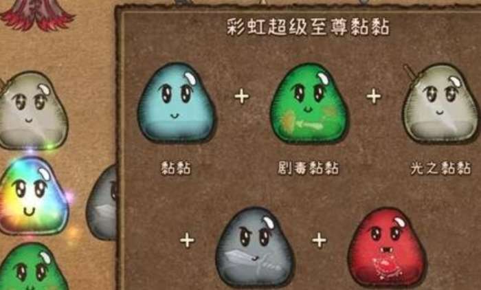 彩虹黏黏不是能够直接合成得而是需要合成出四种不同的黏黏,然后把这四种黏黏和一种普通的黏黏给合成起来才可以,这四种黏黏分别是剧毒黏黏、光之黏黏、钢之黏黏以及血之黏黏。