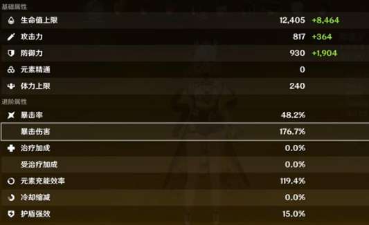 3、面板数据,生命值2W+,攻击力1181,防御力2834,暴击率48.2%,暴击伤害176.75