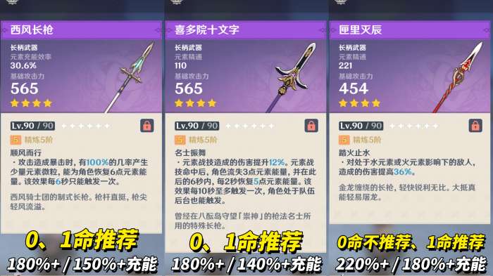 【0命叶洛亚】推荐前2把武器,充能压力相对小许多。西风长枪考虑带个暴击头触发武器效果,喜多院十文字则需6秒回能叶洛亚得先战技起手。