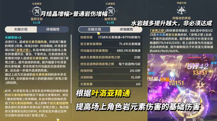 ③当队伍存在1/2/3名水或岩角色时,「夜莺之歌」额外基于叶洛亚元素精通提升基础伤害,岩元素伤害7%/14%/24%精通,月结晶伤害48%/96%/160%精通。