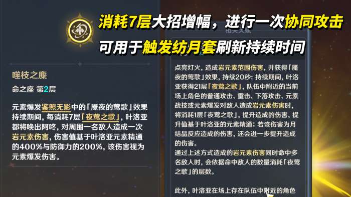 2命,元素爆发期间每消耗7层「夜莺之歌」,叶洛亚会造成一些400%精通200%防御的单体伤害。叶洛亚唯一后台脱手出伤机制,可触发纺月套延续BUFF。