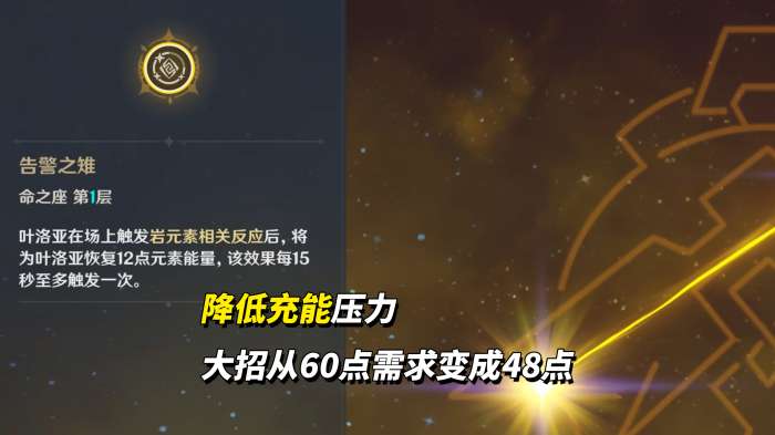 1命,叶洛亚触发岩伤后恢复12点能量。元素爆发是60点能量,可以降低充能压力(具体充能后面配装会讲)。