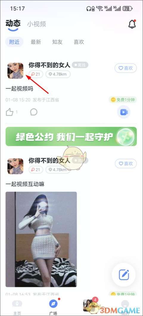 1、进入app后,点击广场,找到一个想添加的好友,点击其头像;