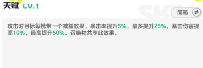 天赋为根据攻击目标所携带的Debuff数量,可提升奥丁与其召唤物的暴击率与暴击伤害:每有一个Debuff,暴击率就提升5%,最多提升25%,暴击伤害提高10%,最高提升50%。