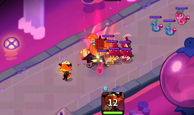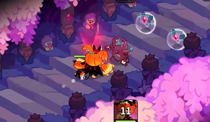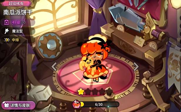 游戏里每个饼干都会有自己的特性,对战过程中能触发的技能也会有所区别,南瓜饼干在游戏里非常有辨识度,角色会穿着橙色的大裙摆服饰,同时头上也会有一头亮眼的橙色头发,在头上和角色背后,会有黑白两色元素点缀,玩家在看到之后都会想到万圣节的南瓜,作为魔法型角色,适合放置在中排输出,触发技能皮皮帮帮我之后,在游戏里生成大范围的伤害,每次触发技能之后,同时还会让对方获取减少治愈的简易效果,技能在游戏里还可以召唤大量的召唤兽,非常适合用来攻击或者干扰对方。